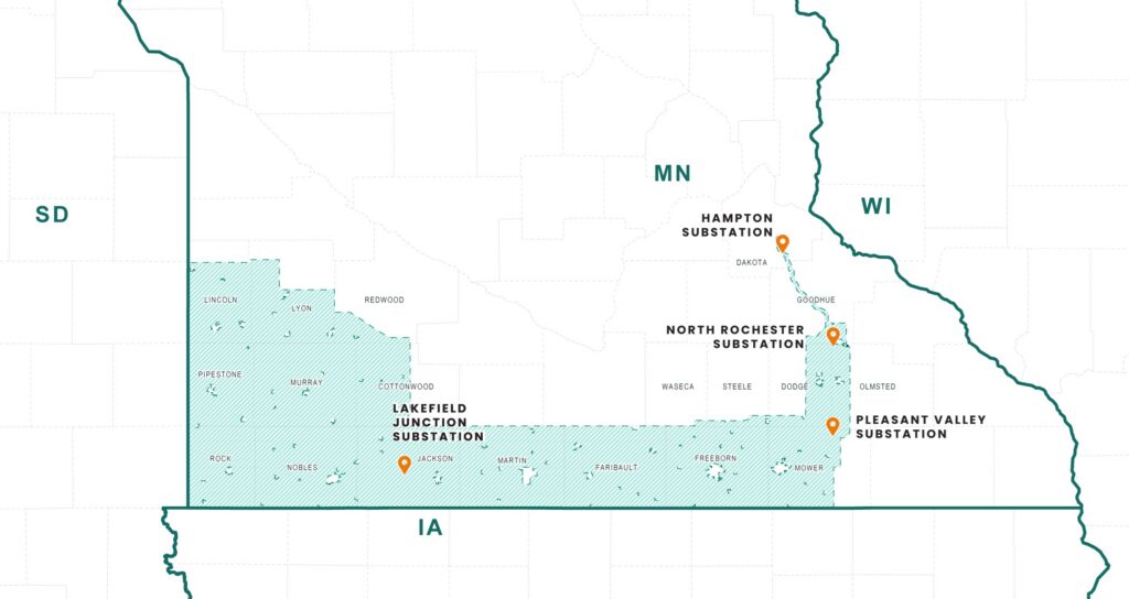 PowerOn Midwest is a series of new electric transmission projects anchored by a 765-kilovolt (kV) backbone transmission line that will connect to the transmission grid in eastern South Dakota and northwestern Iowa, travel across southern Minnesota and connect to the broader regional grid. In Minnesota, the 765-kV line will connect the Lakefield Junction, Pleasant Valley and North Rochester substations in Jackson, Mower and Olmsted counties.