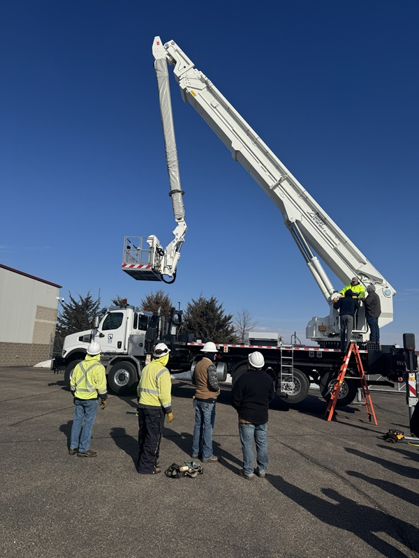 Because Bronto is a new manufacturer for Great River Energy, crews recently completed in‑service training on the unit, gaining hands-on experience with its features and operation. One of the most notable capabilities is that the truck is tested and rated to 500 kilovolts for bare-hand work methods, which is a first for the cooperative.
